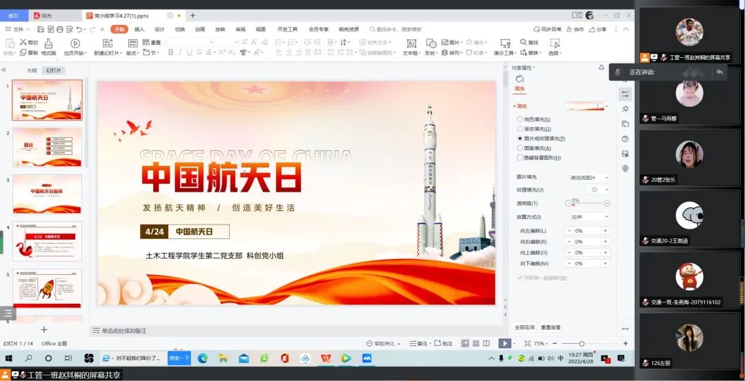 首先,由党员同志对本次内容进行简单的概括。2022年4月24日,我们迎来了第七个中国航天日,中国航天事业走过了风风雨雨的六十余载,取得越来越多举世瞩目的成就。神舟十三号在万众瞩目中胜利返回,我国再次刷新了中国在太空探索领域的高度,实现了中国航天科技的又一次新跨越。星空浩瀚无比,中国人对宇宙的探索也永无止境。
