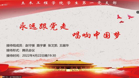 2022年4月24日晚19:30,永利yl23411员工第一党支部在腾讯会议开展了主题为“永远跟党走,唱响中国梦 ”的积极分子接待活动。本次接待组组长为赵守继同志,接待组组员为张文凯同志、王越华同志和路宇豪同志。