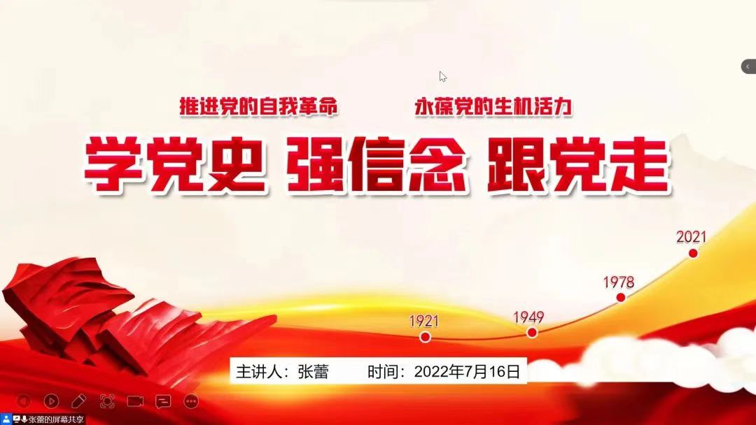 2022年7月16日晚7:30,永利yl23411员工第一党支部于线上腾讯会议开展了以“学党史强信念跟党走”为主题的党课学习,主讲人为张蕾老师,支部全体党员参与学习。