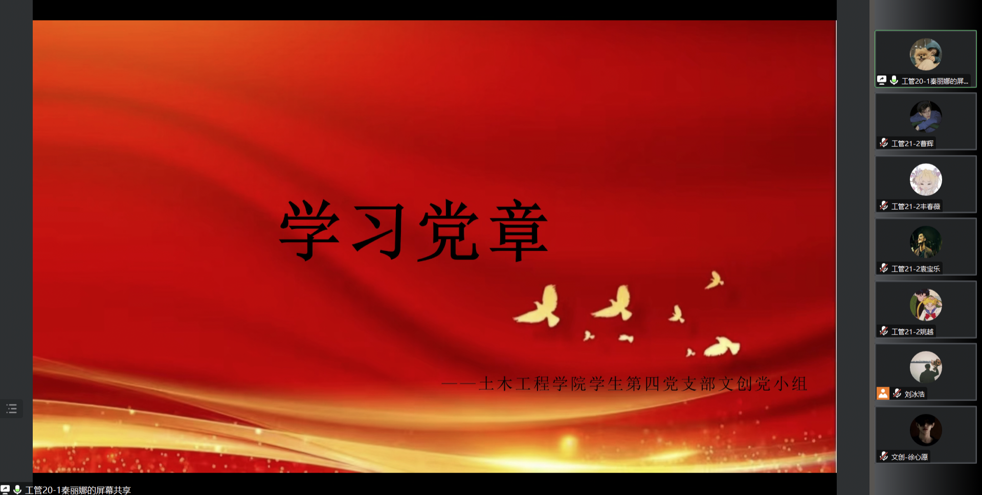 文创党小组开展了本次学习,本次学习的主持人为秦丽娜同志。首先由赵其桐同志、张淼琪同志、秦丽娜同志讲解本次学习的主要内容,随后由积极分子分享自己的学习感悟。发言结束后,秦丽娜同志对本次学习进行总结,全体党员以及积极分子要逐条逐句通读党章,全面理解党的纲领,牢记入党誓词,牢记党的宗旨,牢记党员义务和权利,尊崇党章、遵守党章、维护党章,坚定理想信念,对党绝对忠诚。