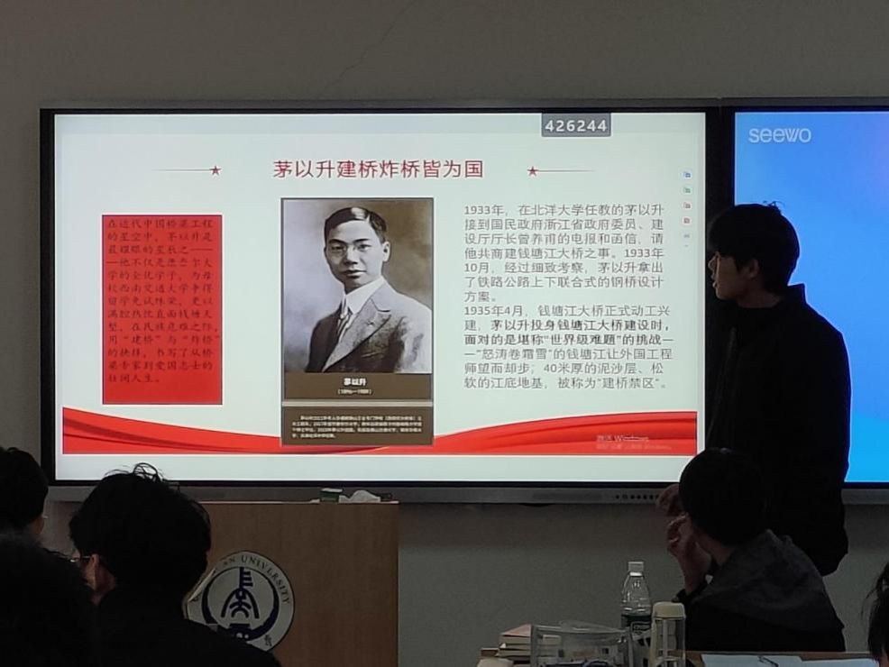 师生以分组讨论形式,学习茅以升、董石麟、王平洋三位前辈的事迹。从茅以升1933年攻克钱塘江“建桥禁区”、“建桥炸桥皆为国”的担当,到三位前辈共有的“矢志报国、攻坚克难、深耕专注”品质,大家深刻认识到实干精神是强国发展的根基。