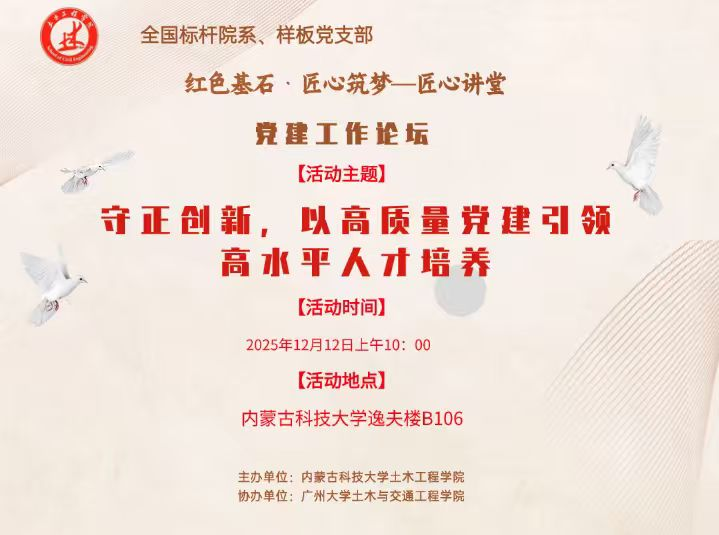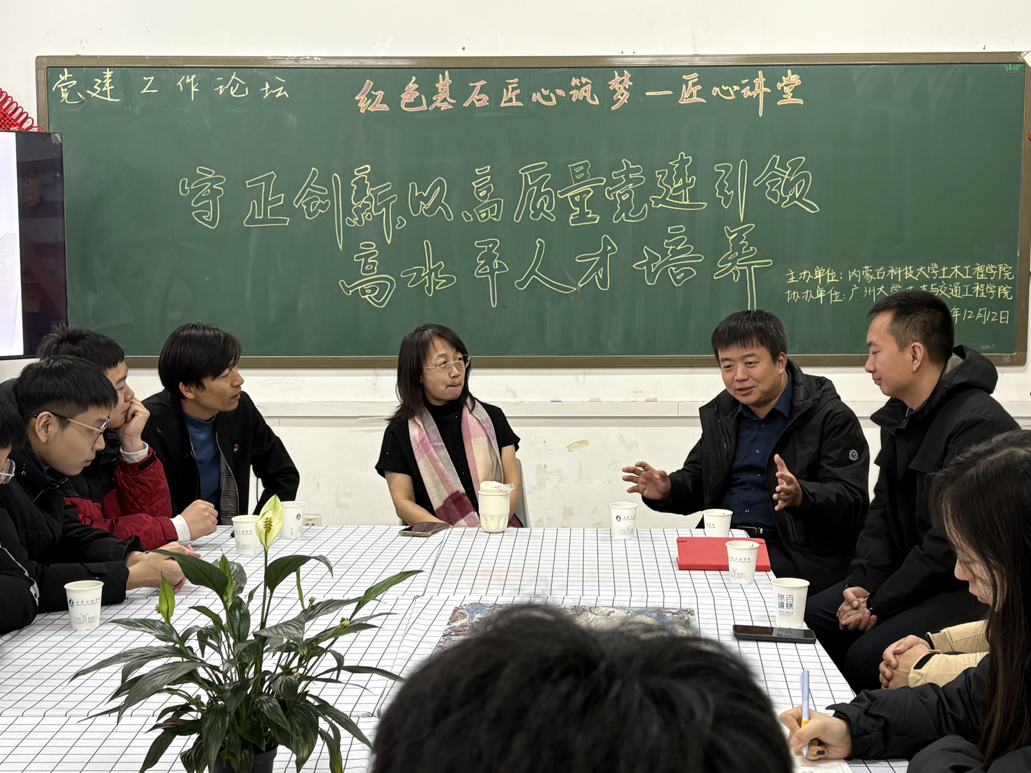 2025年12月12日,永利yl23411携手广州大学土木与交通工程学院,成功举办“红色基石·匠心筑梦——匠心讲堂”党建工作论坛。本次论坛以“守正创新,以高质量党建引领高水平人才培养”为核心主题,旨在搭建校际党建交流平台,共话新时代土木类专业人才培养新策略。