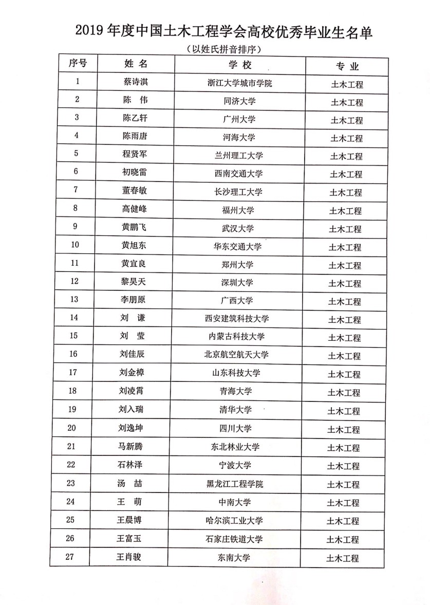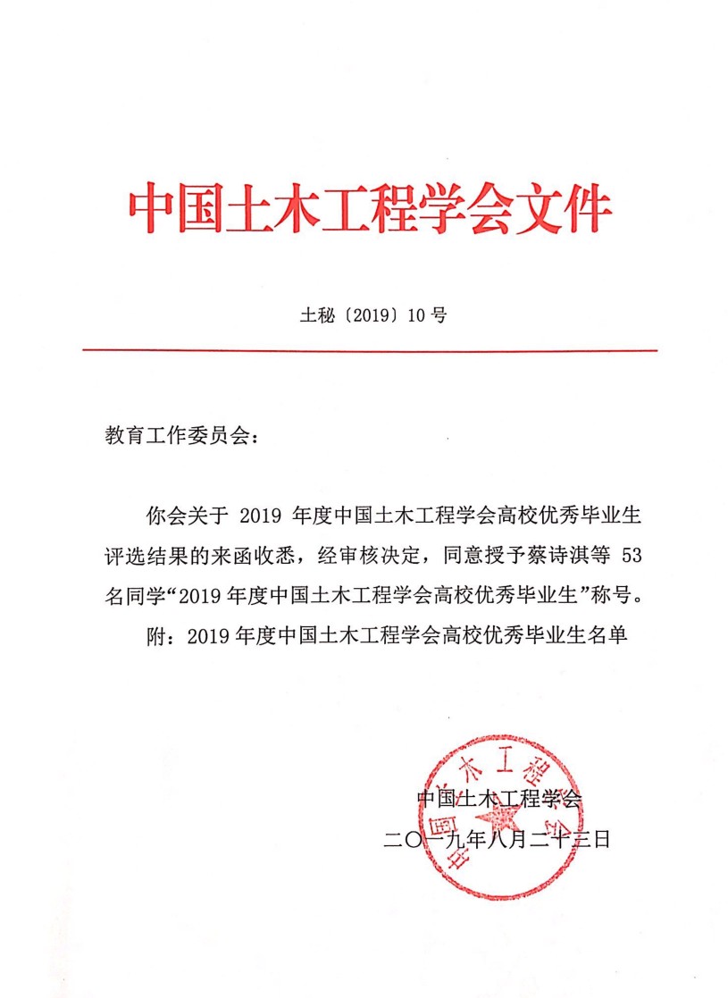 公司土木2015级刘莹同学被评为本年度中国土木工程学会高校优秀毕业生