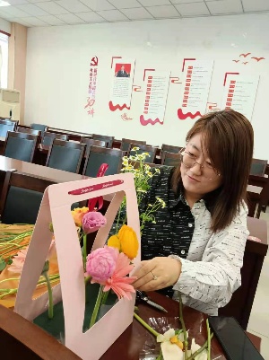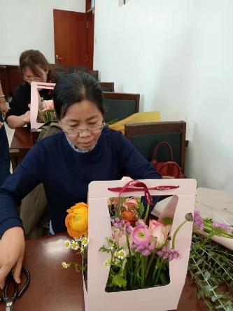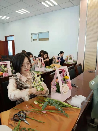 活动现场,花艺老师为大家介绍了花艺知识、讲授了插花技巧及鲜花保养方法。女教工们个个心灵手巧,修枝剪叶,搭配色系,普通的花叶、枝条,经过大家精心的修饰与加工之后,变成了令人赏心悦目的插花作品。在花香四溢的生机与浪漫中,大家舒缓身心,充分感受到生活的美好与情趣。