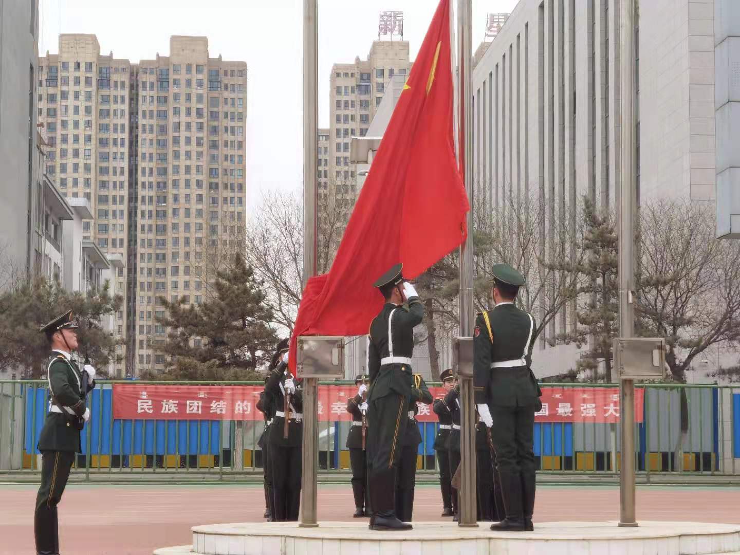 7:30,全院师生在田径场排列整齐,英姿飒爽的国旗护卫队护送五星红旗入场,伴随着雄壮的《义勇军进行曲》,五星红旗徐徐升起。全院师生行注目礼,共同唱响国歌,点燃了炽热的爱国之情。