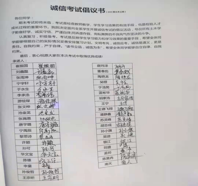 本学期学习生活已接近尾声,期末考试临近,为进一步激发同学们备考的积极性,树立良好的学风、考风,营造文明、诚信考试的良好氛围,提高同学们的道德修养和思想素质,永利yl23411于2021年6月20日至6月30日开展了“严肃考风考纪,建设优良学风”活动。