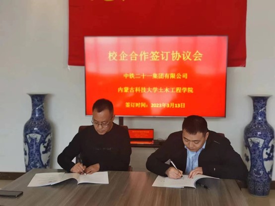(中铁二十一局道桥公司人力资源部副部长李明,学院领导郭海、王晓东、许有俊、王英浩等参加签约仪式)