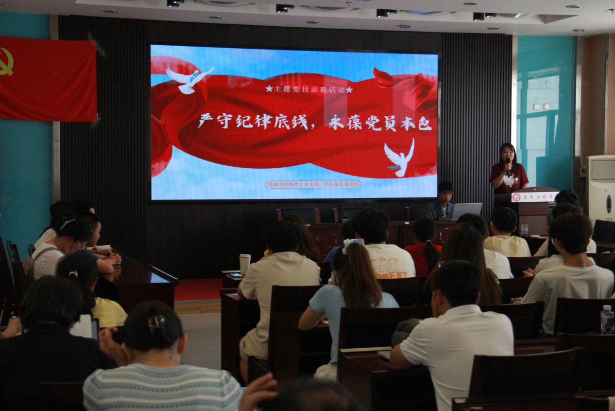 为深入学习贯彻习近平总书记关于党纪学习教育的重要讲话精神,加强党员的自我约束和党性修养,在公司党委组织部和土木工程公司党委的指导下,交通力学系教工党支部联合员工第五党支部于2024年7月1日下午3点,在逸夫楼B404举办了“严守纪律底线,永葆党员本色”主题党日示范活动。校内基层党组织代表观摩了此次活动。活动由交通力学系教工党支部书记张新洁同志主持。