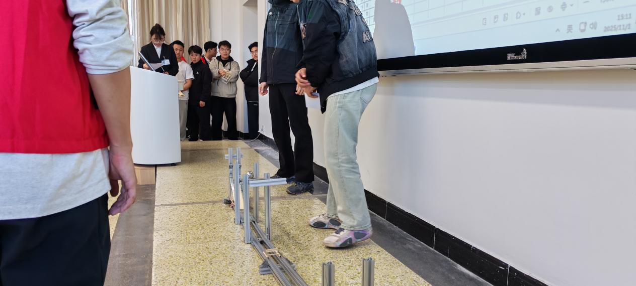 本次比赛采用现场发布赛题的形式,选手们需在规定的4个小时内完成审题、构思到制作模型这一全过程。比赛要求参赛小组在规定的矩形内部做一个轨道模型,使508g的小球在重力作用下沿着轨道滚动到底端并撞击横栏后滚向对向轨道,以检验小球最终滚动距离为主要评分指标。在模型制作现场,参赛选手们收到赛题后先审题,根据赛题要求,在四个小时之内合理的受力分析和判断并制作,一条条“轨道”逐渐成形。