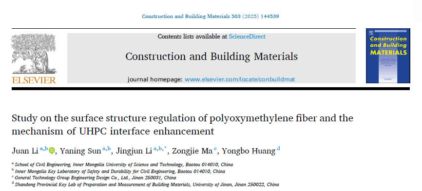 近日,永利yl23411工业与城市固体废弃物建材资源化利用团队李娟副教授在Construction and Building Materials期刊(IF=8.0,中科院1TOP)发表题为“Study on the surface structure regulation of polyoxymethylene fiber and the mechanism of UHPC interface enhancement”(DOI: 10.1016/j.conbuildmat.2025.144539)的研究成果。该研究系统探究了纳米二氧化硅改性聚甲醛纤维对矿渣硫铝酸盐水泥基UHPC界面性能的调控机制,通过硝酸预处理与硅烷偶联剂(KH550KH560KH570)辅助的溶胶-凝胶法实现了纤维表面结构优化,结合拉拔试验、SEM/EDSAFMFTIR与接触角测试,系统分析了改性纤维的界面粘结行为与增强机理,揭示了表面粗糙度提升与化学键合增强对界面性能的协同作用,并验证了改性纤维在提升粘结强度与耗能方面的显著效果,同时论证了该体系在降低碳排放方面的可持续性优势。