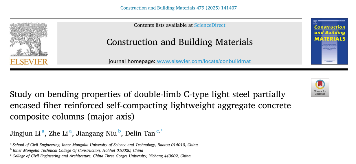 近日,永利yl23411工业与城市固体废弃物建材资源化利用团队李京军教授在Construction and Building Materials期刊(IF=8.0,中科院1TOP期刊)发表题为Study on bending properties of double-limb C-type light steel partially encased FSLC composite column (major axis)”(DOI:10.1016/j.conbuildmat.2025.141407)的研究成果。