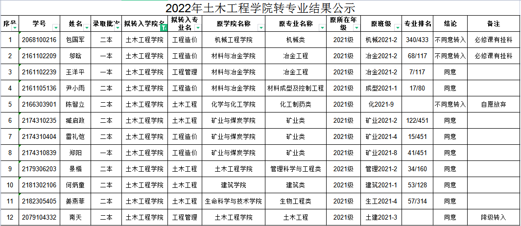 经永利yl23411转专业工作考核领导小组对拟转入员工进行资格审核,党政联席会上会通过,确定转入员工名单,结果公示如下: