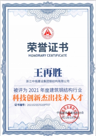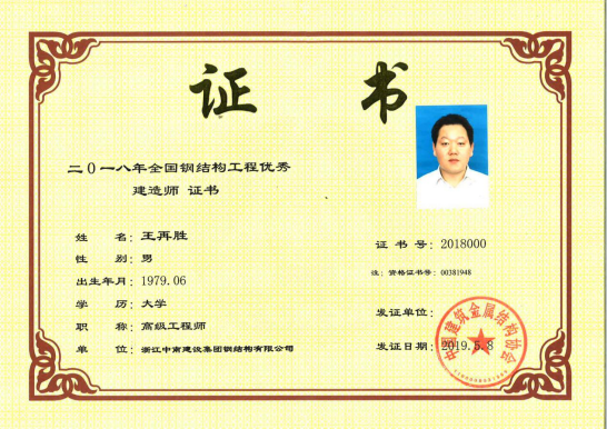 王再胜,男,1979年6月,祖籍:浙江省天台县,政治面貌:群众,学历:本科,职称:高级工程师。现工作单位:浙江中南绿建科技集团有限公司,职务:总工程师。