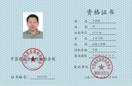 2011年6月取得一级注册结构工程师职业资格,2013年9月取得一级建造师执业资格。