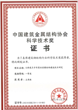 《大跨度月牙形柔性索膜结构建造技术研究》的研究成果获得了中国建筑金属结构协会科学技术奖“一等奖”