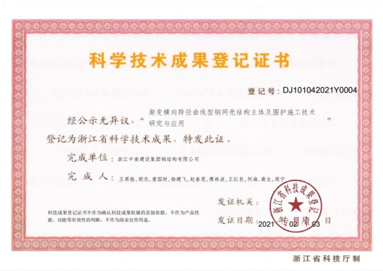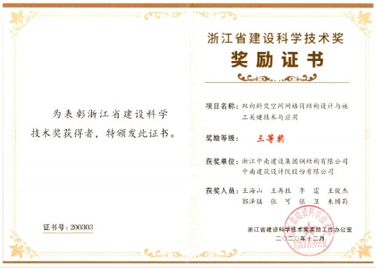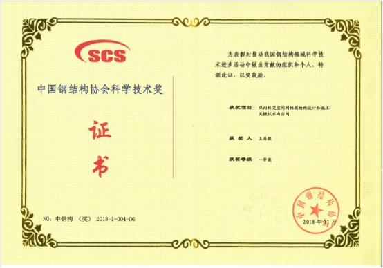 《双向斜交空间网格筒结构设计和施工关键技术与应用》的研究成果获得了中国钢结构协会科学技术奖“一等奖”