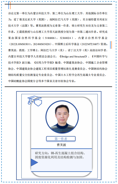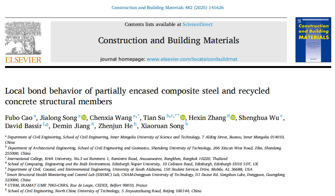 近日,永利yl23411城市固体废弃物建材资源化利用团队曹芙波教授在Construction and Building Materials期刊(IF=7.4,中科院1区TOP)发表题为“Local bond behavior of partially encased composite steel and recycled concrete structural members”(DOI: 10.1016/j.conbuildmat.2025.141626)的研究成果。该研究通过推出试验探讨了部分包裹再生混凝土结构构件的黏结行为,并基于灰度相关理论评估了不同参数(再生混凝土强度、锚固长度和栓钉层数)对黏结性能的影响。最终,通过对试验结果统计回归,给出了考虑黏结部位和深度的黏结滑移本构模型。