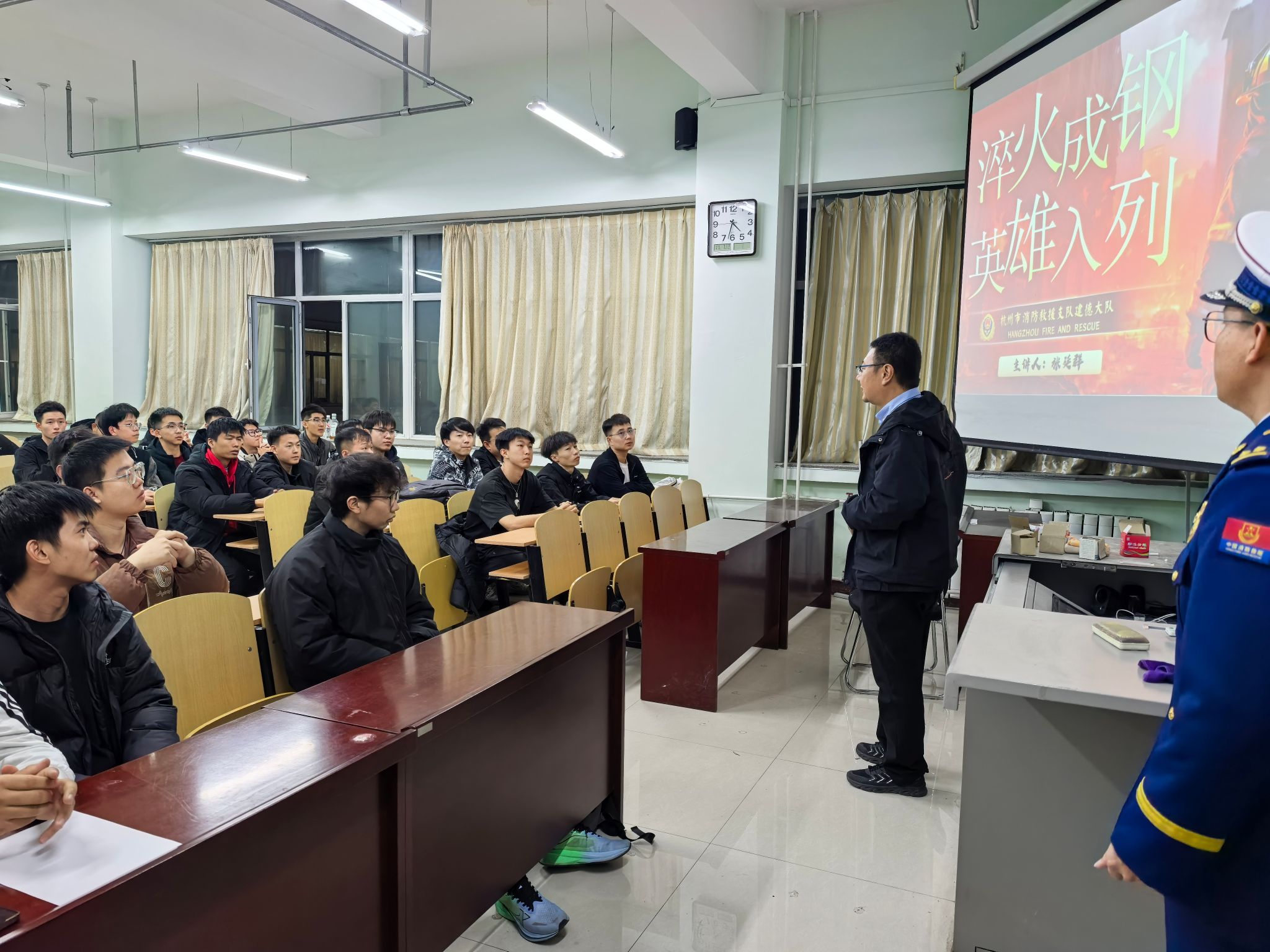 2025年11月7日晚19:30,杭州市消防救援支队建德大队“淬火成钢 英雄入列”招录宣讲会在逸夫楼F401教室开讲,众多大四同学积极参与。