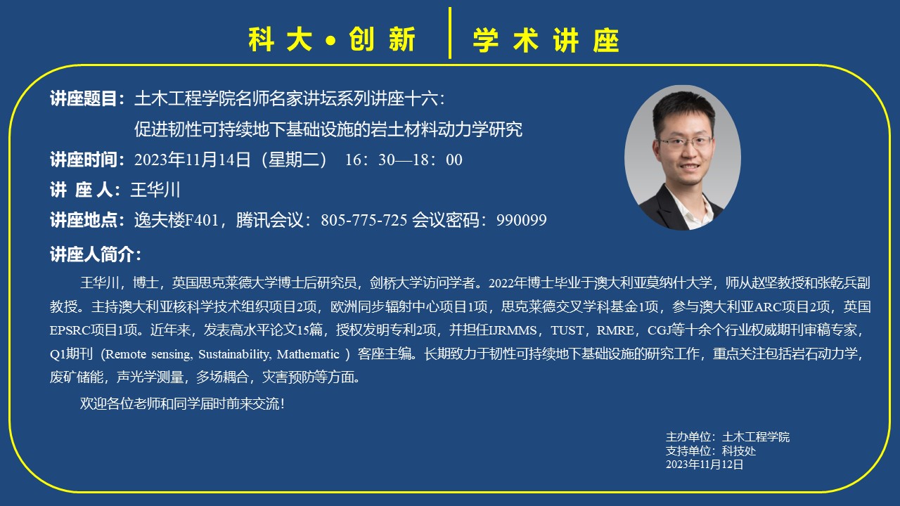 讲座题目:促进韧性可持续地下基础设施的岩土材料动力学研究