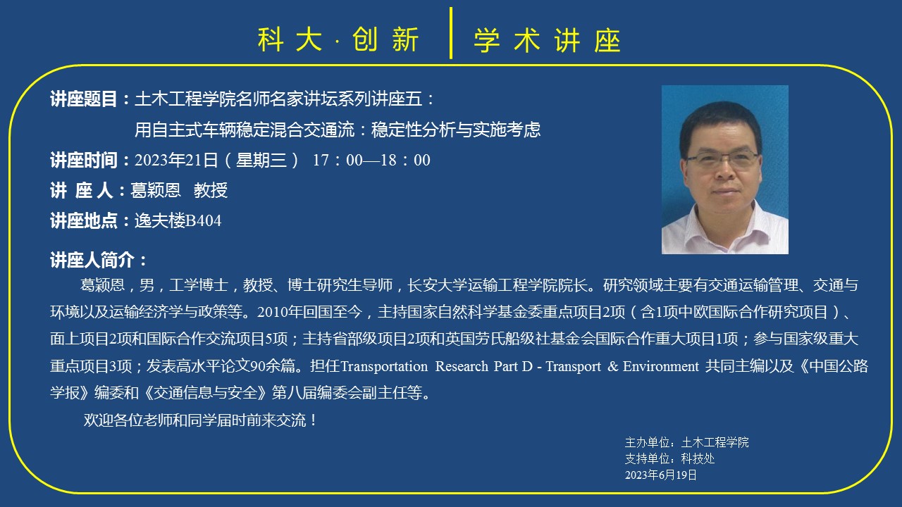 永利yl23411名师名家讲坛系列讲座五——用自主式车辆稳定混合交通流:稳定性分析与实施考虑