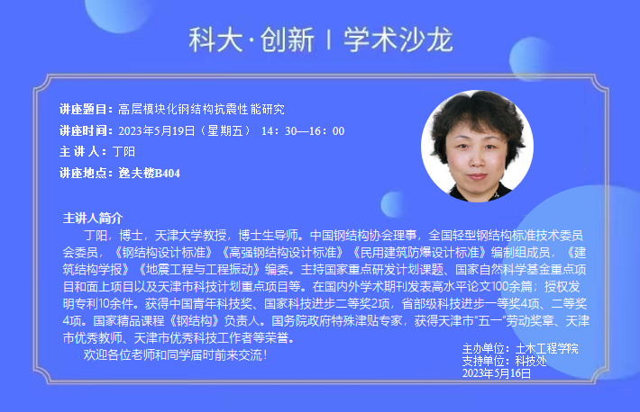 讲座题目:永利yl23411名师名家讲坛系列讲座一 ——高层模块化钢结构抗震性能研究