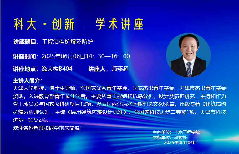 在爆炸荷载作用下,建筑结构会产生不同程度的损伤,甚至可能发生连续性倒塌。建筑结构性能评价是爆炸灾后重建阶段结构处置与修复加固方式选择的重要依据,是指在爆炸发生之后,考虑建筑爆炸损伤,对建筑结构的残余性能进行分析和评定。本次讲座对爆炸灾后建筑结构性能评价涉及的一些关键问题进行详细的介绍与总结,并对可行修复加固技术的相关研究及应用进行总结与评述。