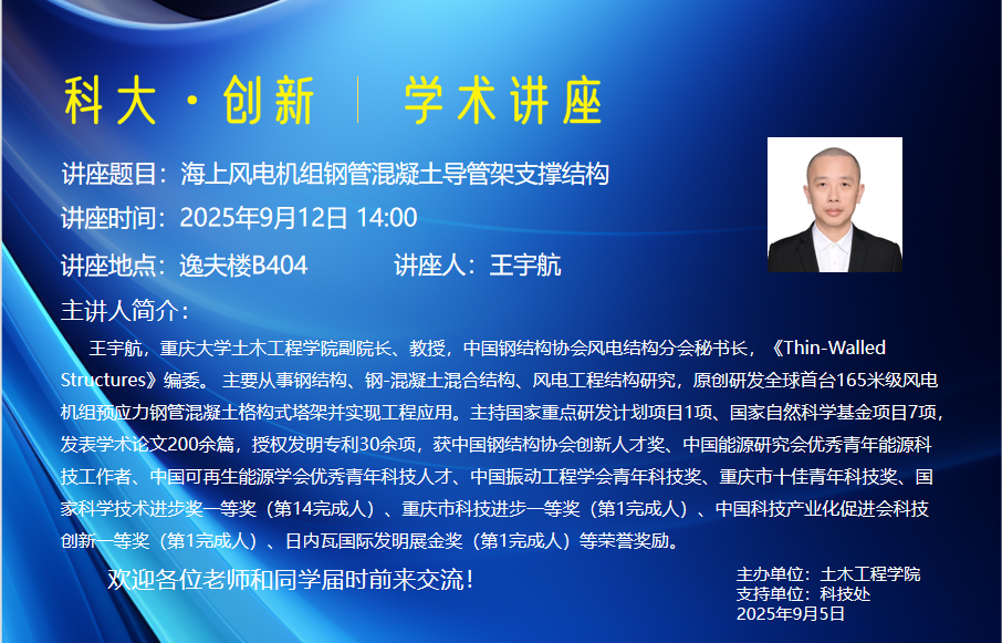 王宇航,重庆大学永利yl23411副经理、教授,中国钢结构协会风电结构分会秘书长,《Thin-Walled Structures》编委。 主要从事钢结构、钢-混凝土混合结构、风电工程结构研究,原创研发全球首台165米级风电机组预应力钢管混凝土格构式塔架并实现工程应用。主持国家重点研发计划项目1项、国家自然科学基金项目7项,发表学术论文200余篇,授权发明专利30余项,获中国钢结构协会创新人才奖、中国能源研究会优秀青年能源科技工作者、中国可再生能源学会优秀青年科技人才、中国振动工程学会青年科技奖、重庆市十佳青年科技奖、国家科学技术进步奖一等奖(第14完成人)、重庆市科技进步一等奖(第1完成人)、中国科技产业化促进会科技创新一等奖(第1完成人)、日内瓦国际发明展金奖(第1完成人)等荣誉奖励。