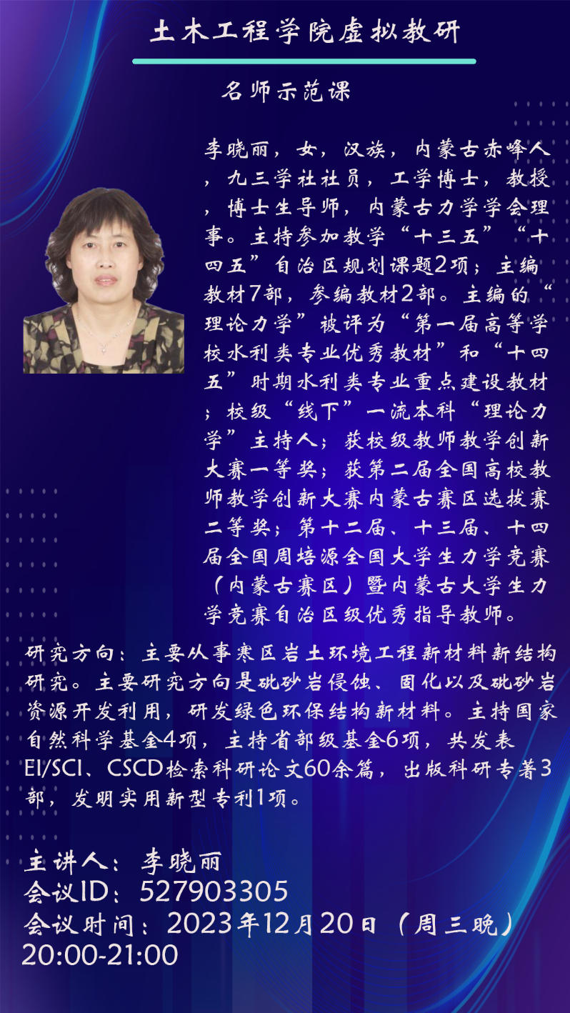 2023年12月20日晚,永利yl23411虚拟教研室“名师示范课”系列第二场活动顺利举行。李晓丽教授以“力学教学创新与科研反哺课堂的探索与实践”为主题,通过腾讯会议平台带来了一场内容丰富、见解独到的教学盛宴,吸引了全国多所高校教师与研究生的积极参与。