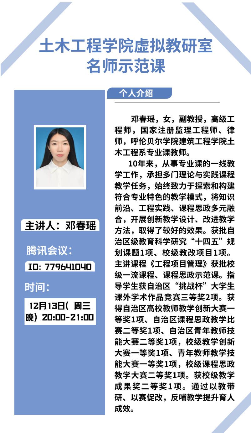 2023年12月13日晚,永利yl23411虚拟教研室“名师示范课”系列第三场活动圆满落幕。邓春瑶副教授以“工程项目管理课程的教学创新与实践探索”为主题,通过腾讯会议平台呈现了一场跨界融合、理念创新的教学示范,吸引了全国多所高校教师与行业专业人士的积极参与。