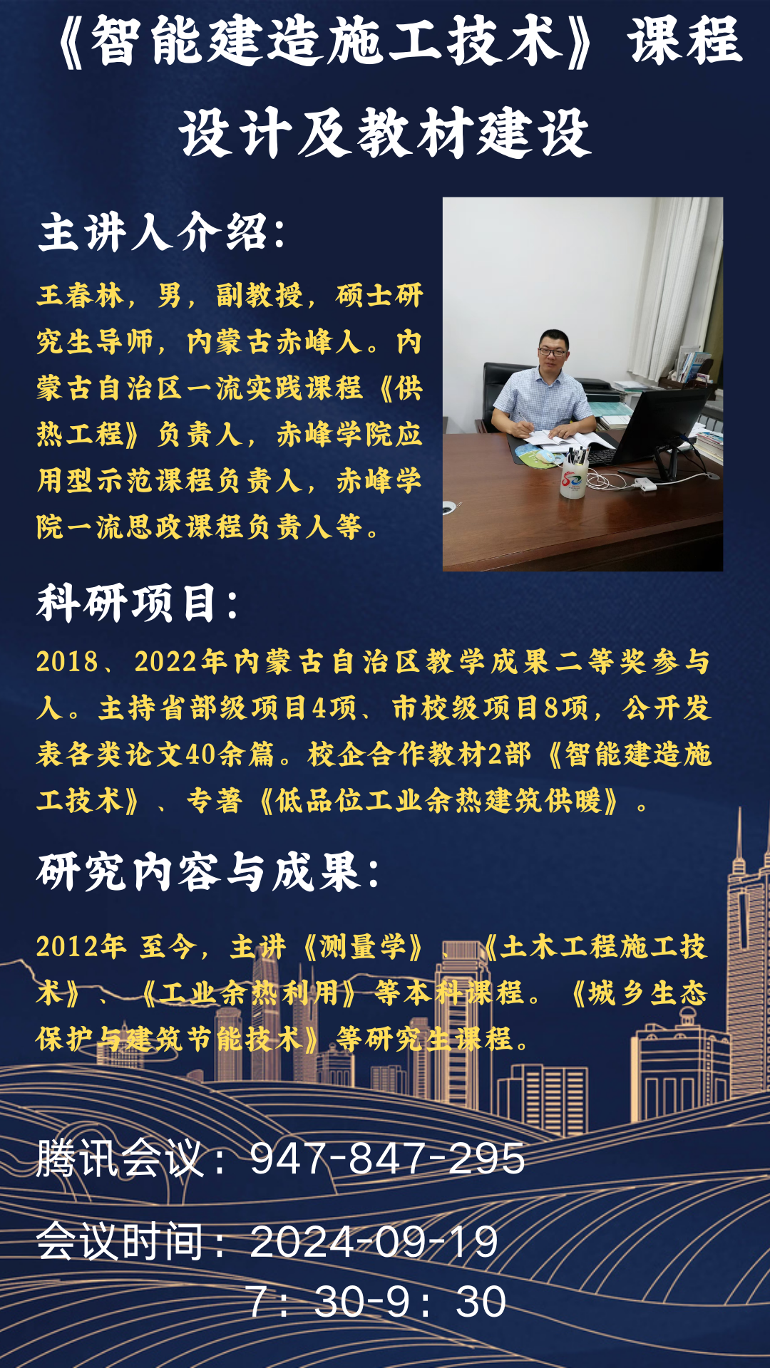 2024年9月19日晚,土木工程虚拟教研室第五场示范课成功举办。赤峰学院王春林副教授以“《智能建造施工技术》课程设计与教材建设”为主题,通过腾讯会议平台分享了其在应用型课程建设与教材开发方面的丰富经验,为与会师生呈现了一场内容扎实、实用性强的教学盛宴。