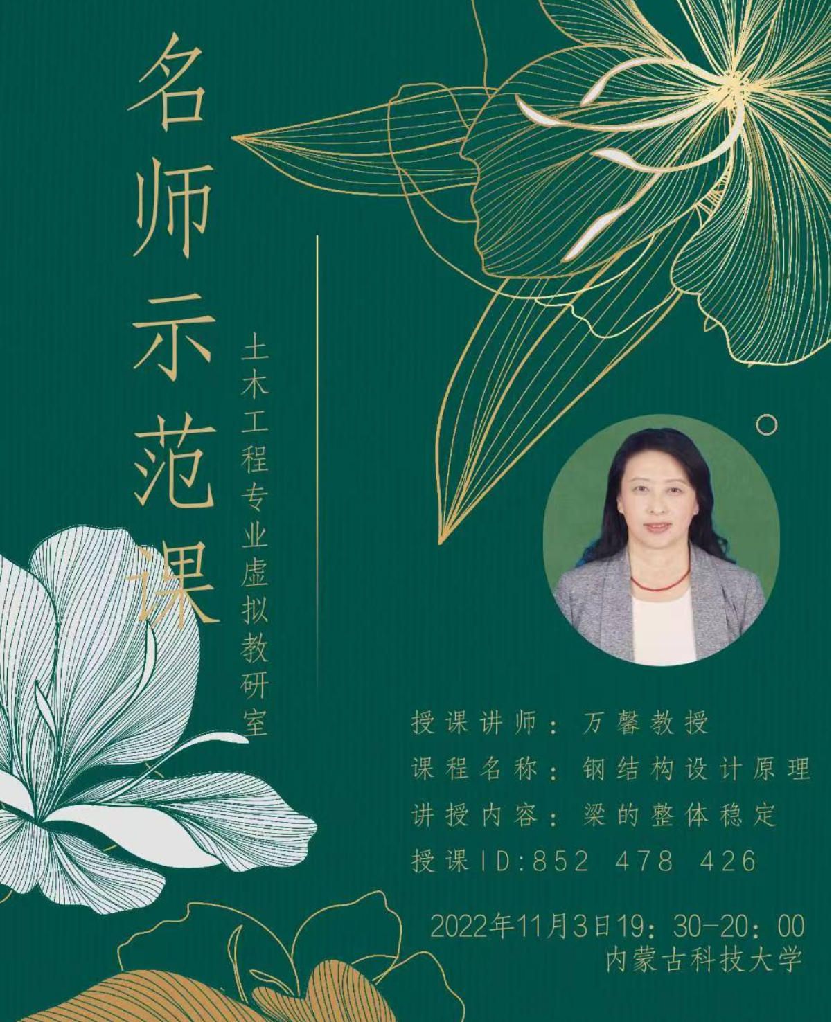 2022年11月3日晚,土木工程专业虚拟教研室名师示范课系列活动如期举行。永利yl23411万馨教授以《钢结构设计原理》中的“梁的整体稳定”为核心内容,通过腾讯会议平台呈现了一堂深入浅出的专业课程教学示范,为全国土木工程专业师生展示了难点内容的教学突破与创新。