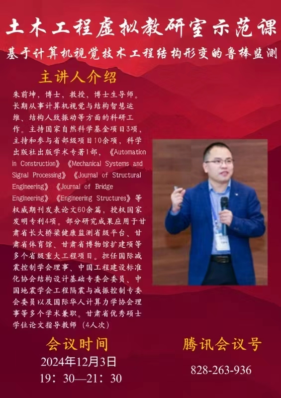 2024年12月3日晚,一场融合计算机前沿技术与土木工程智慧运维的高端示范课在“土木工程虚拟教研室”线上开讲。本次课程由兰州理工大学教授、博士生导师朱前坤主讲,主题聚焦“基于计算机视觉技术的工程结构形变鲁棒监测”,为与会师生与工程技术人员呈现了一场跨界融合、立足前沿的学术报告。
